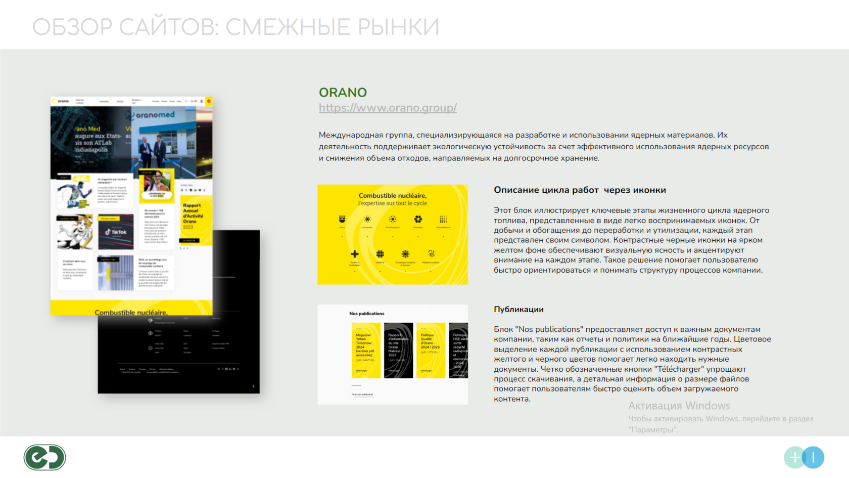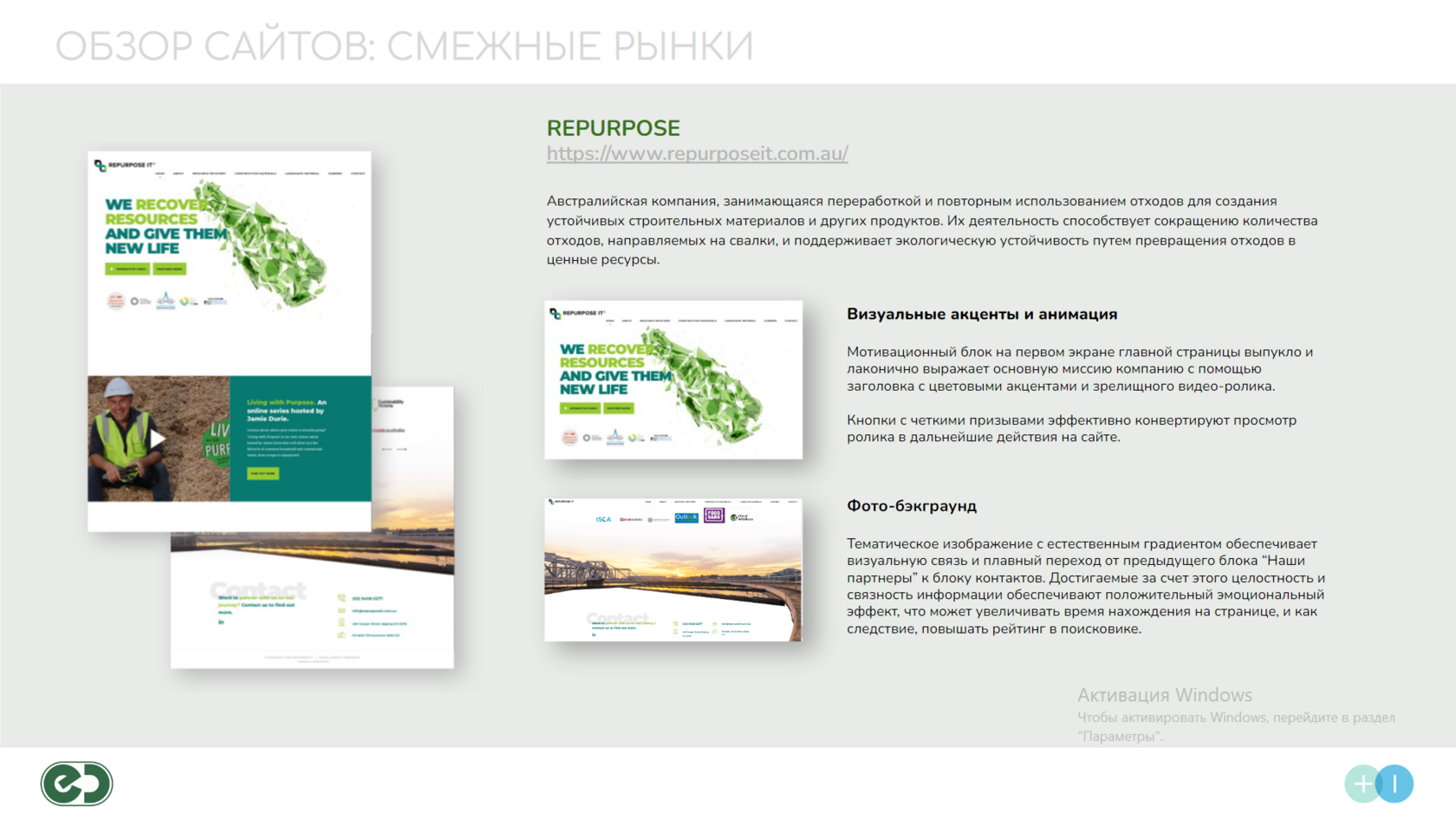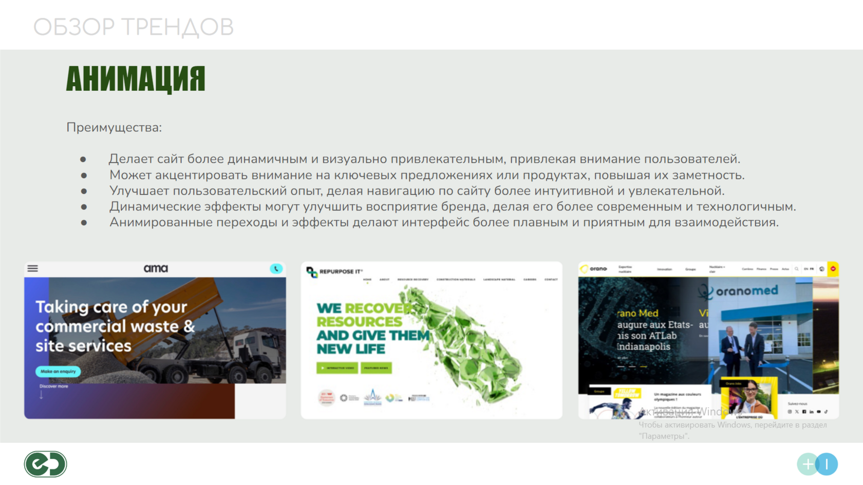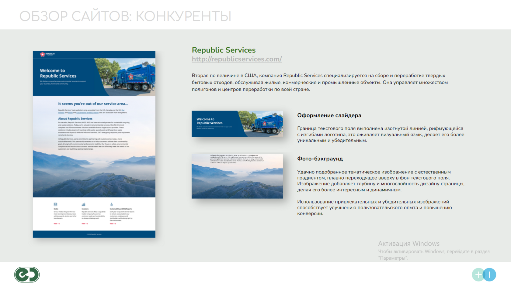 Визуальные элементы, такие как блок с цифрами (количество тонн отходов, переработанных компанией), эффективно подчеркивают важные факты, привлекая внимание к достижениям компании. Четкость и простота этих блоков делают информацию легко усваиваемой.