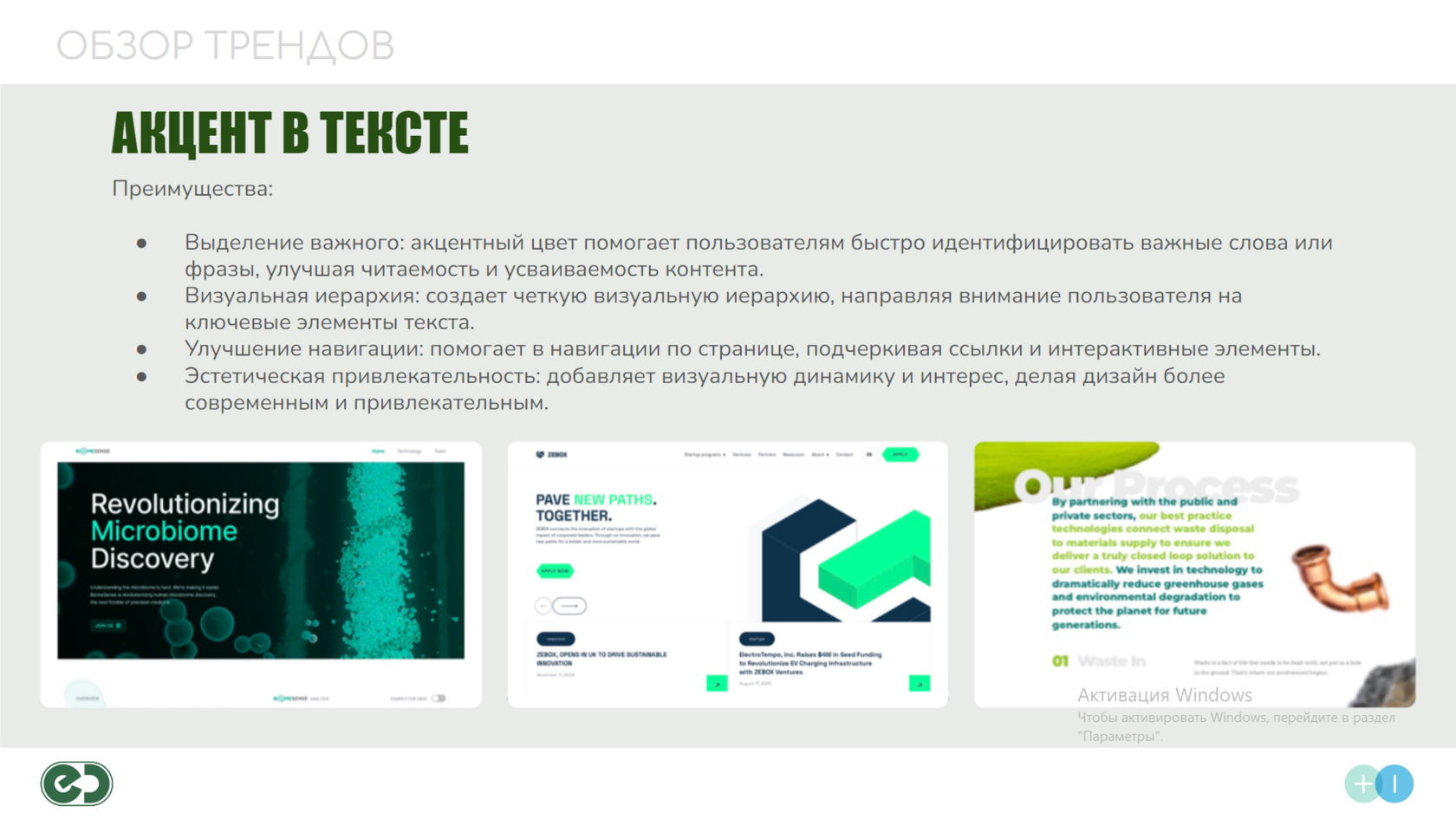 Гармоничная цветовая палитра с преобладанием зелёных и естественных оттенков ассоциируется с экологией и устойчивым развитием. Это вызывает у пользователей чувство доверия и стабильности, соответствуя миссии компании.