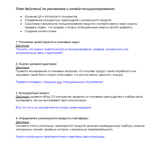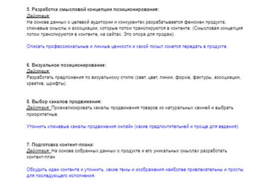 Важно через смыслы передать людям, что продаем и почему потенциальные клиенты захотят доверять. Составить список уникальных характеристик продукта, включая индивидуальную подборку, энергию натуральных камней, семейную историю, и визуальную привлекательность. На основе данных о целевой аудитории и конкурентах разрабатывается феномен продукта, ключевые смыслы и ассоциации, которые потом транслируются в контенте. (Смысловая концепция потом транслируются в контенте, на сайтах. Это опора для продаж). Разработать предложения по визуальному стилю (свет, цвет, линии, форма, фактуры, ассоциации, креатив, шрифты).